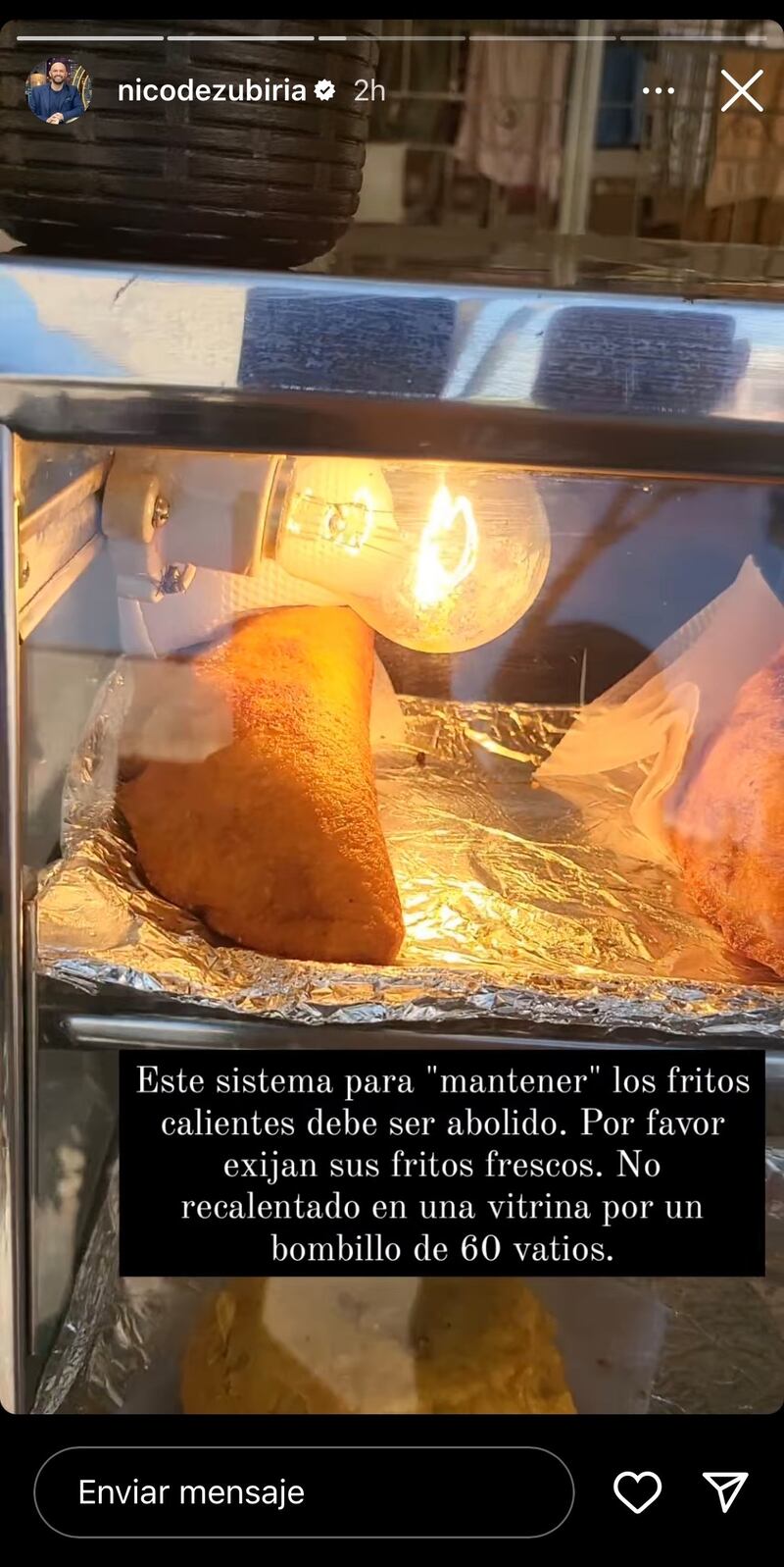 Asimismo, Nicolás indicó: “No recalentado en vitrina por un bombillo de 60 vatios”. Como era de esperarse, los comentarios por parte de sus seguidores no se hicieron esperar, hubo quienes estuvieron de acuerdo con el chef indicando que en muchas ocasiones las personas “ignoran” los mecanismos en los que son preparados o quizás, como se mantienen antes de ser ingeridos lo que podría poner en riesgo la salud de quienes los consumen.