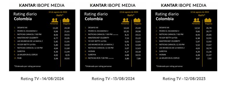 Una de las principales maneras en las que se llega a medir que tan exitosa termina siendo una producción de entretenimiento es a partir del ‘rating’ que a diario es revelado por ‘Kantar Ibope Media’, donde la constante del primer puesto indiscutiblemente se lo ha llevado el ‘Desafío XX’ que ha logrado superar un récord que desde hace algún tiempo alcanzando los 12 puntos e incluso los 13, mientras que en el segundo lugar se ubica ‘Pedro el escamoso’, telenovela que desde su estreno no se deja quitar este lugar, dándole todo un respiro a Caracol Televisión y apuntándole a nuevas temporadas de las mismas producciones debido a su éxito.