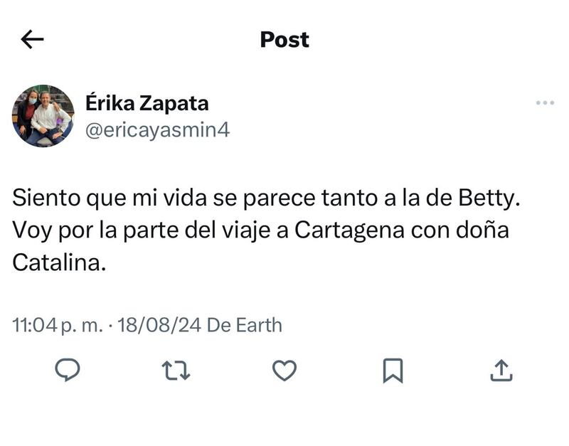 Pues, recientemente, Zapata a través de su cuenta de ‘X’ aseguró: “Siente que mi vida se parece tanto a la de Betty. Voy por la parte del viaje a Cartagena con doña Catalina”. Cabe resaltar que minutos más tarde la periodista de Noticias Caracol recibió uno que otro comentario con respecto a este tema, tanto así que horas después Erika eliminó el respectivo post.