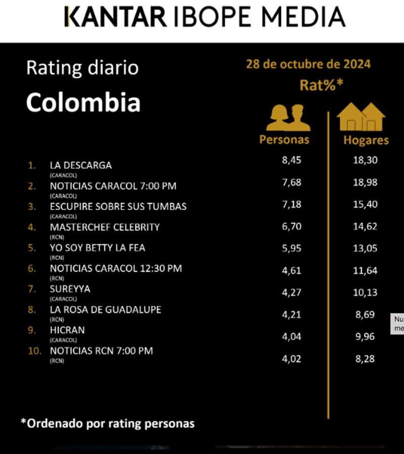 El rating de este 28 de octubre lo encabezó ‘La Descarga’ de Caracol Televisión, obteniendo una puntuación de 8.45 personas, mientras que 18.30 hogares colombianos. En cuanto al segundo puesto se ubicó Noticias Caracol, de las 7 pm, con un 7.68 personas y por ende, 18.98 hogares, y finalmente en el tercer lugar, en su noche de estreno, se ubicó ‘Escupiré sobre tus tumbas’, contando con niveles de 7.18 personas y 15.40 hogares.