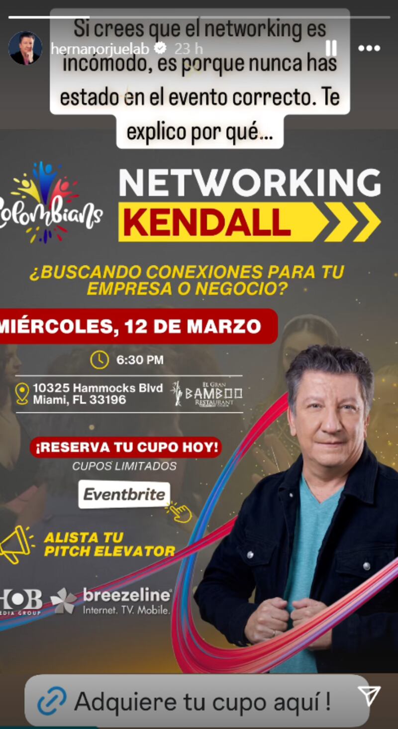 A todas estas labores se le suma una nueva especialización, el ‘networking’, herramienta que permite ampliar las conexiones para cualquier empresa o negocio. Justamente estos conocimientos llevaron a Hernán a ser parte del evento ‘Colombians Networking Kendall’, a realizarse el próximo miércoles 12 de marzo en Hammocks Boulevar de Miami. Si usted se encuentra en EE.UU y quiere ser parte de la experiencia, puede adquirir su cupo en la página del evento por solo USD$25 dólares, unos $102.000 pesos colombianos.