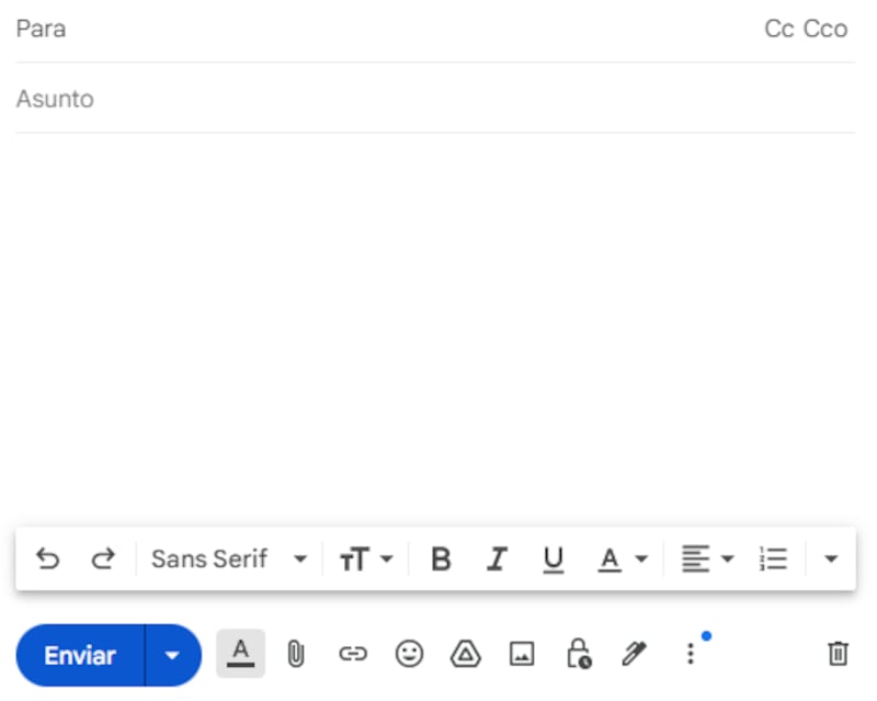 Accede a Gmail en tu navegador web habitual. Haz clic en Redactar para crear un nuevo correo electrónico. Una vez ahí, en la parte inferior de la ventana de redacción, encontrarás un icono de Google Drive, justo entre la opción de Insertar Emoji y la de Insertar Imagen: