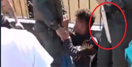 Incluso, uno de los policías allí presentes tiene que sacar su arma de dotación y apuntarla hacia arriba para evitar que la turba siguiera agrediendo al joven, la cual ya le habían roto la naríz.