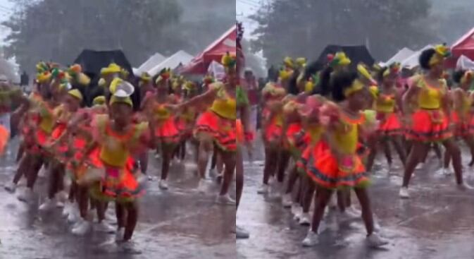En redes, se compartieron videos de los niños en el desfile que quedaron empapados por la lluvia atípica en estos meses, sin embargo, poco les importó mojarse con tal de seguir bailando y gozándose el desfile. Por lo general, los meses de lluvia comienzan en el mes de abril en esta zona del país.