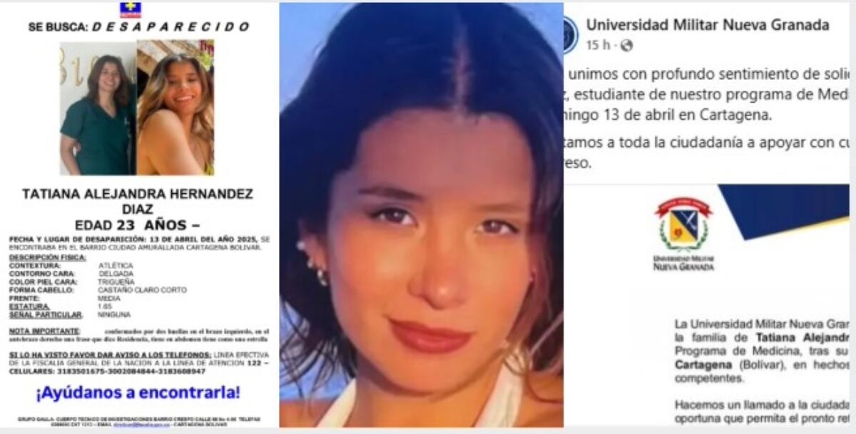 Ante la angustiante situación, la Universidad Militar Nueva Granada, donde cursa sus estudios, publicó un mensaje en sus redes sociales expresando su apoyo a los familiares. “Nos unimos con profundo sentimiento de solidaridad a la familia de Tatiana Alejandra Hernández Díaz, estudiante de nuestro programa de Medicina, quien se encuentra desaparecida desde el domingo 13 de abril en Cartagena. Invitamos a toda la ciudadanía a apoyar con cualquier información que contribuya a su pronto regreso”, señalaron a través de Facebook.