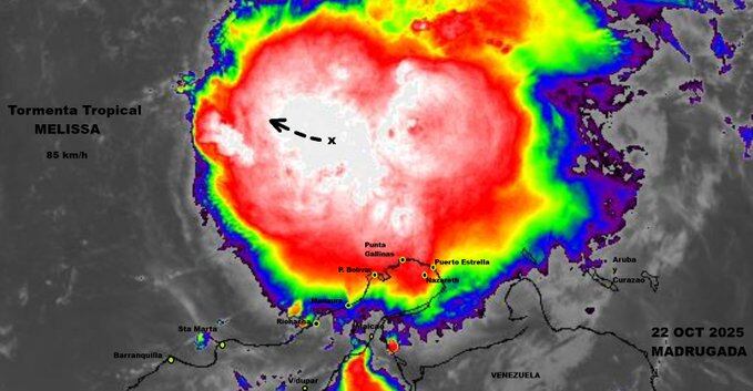 El Instituto de Hidrología, Meteorología y Estudios Ambientales (Ideam) informó la tarde de este martes sobre el fortalecimiento de la tormenta tropical Melissa, la cual se ubica sobre el oriente del mar Caribe, en coordenadas aproximadas 14.2°N – 73.0°W. De acuerdo con el más reciente boletín, el sistema presenta vientos máximos sostenidos de 84 km/h, una presión mínima central de 1003 milibares y avanza hacia el oeste a una velocidad de 24 km/h.
