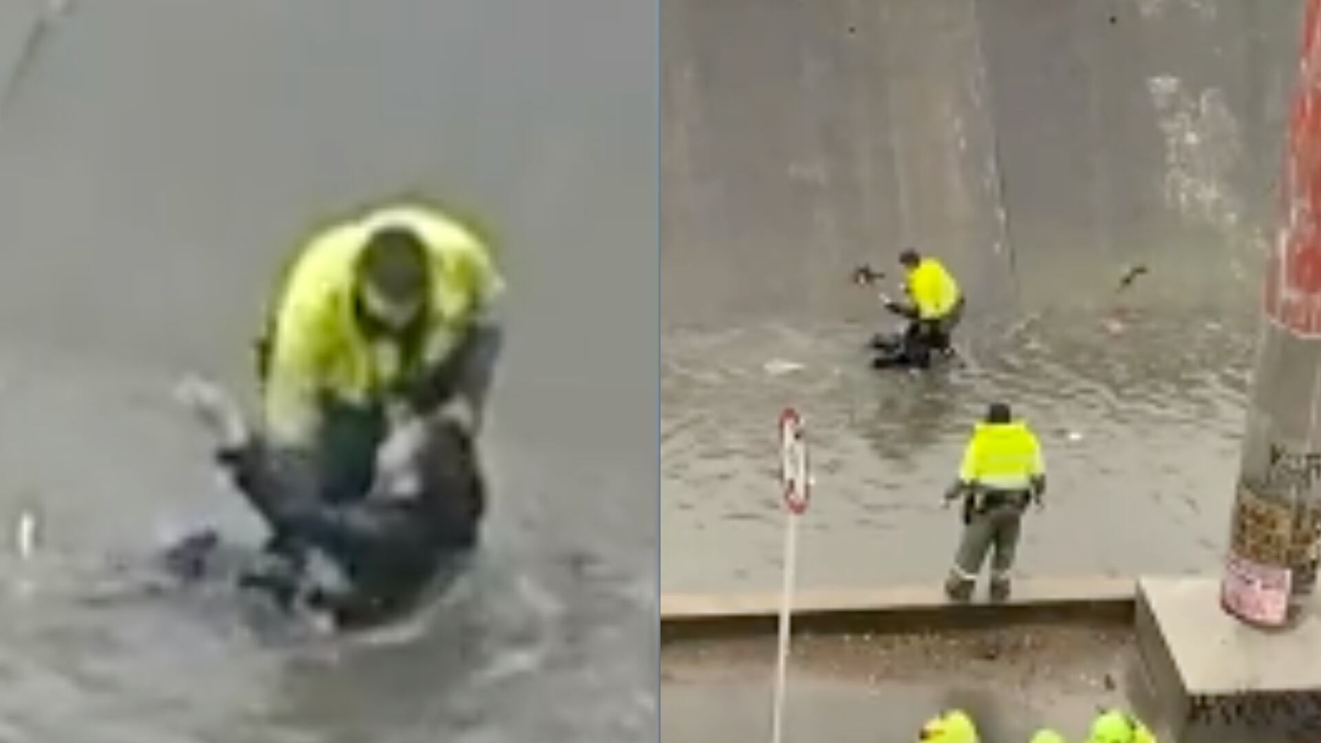 Videos grabados por testigos, muestran el momento en que el patrullero Ángel Henao ingresa al caudal, sin importarle la fuerte lluvia o lo poco salubre del agua, para rescatarlo. “Lo primero que pensé fue en salvaguardar la vida de este ciudadano, en el momento no pensé mucho en lo que podría pasar después”, narró en diálogo con Noticias Caracol.