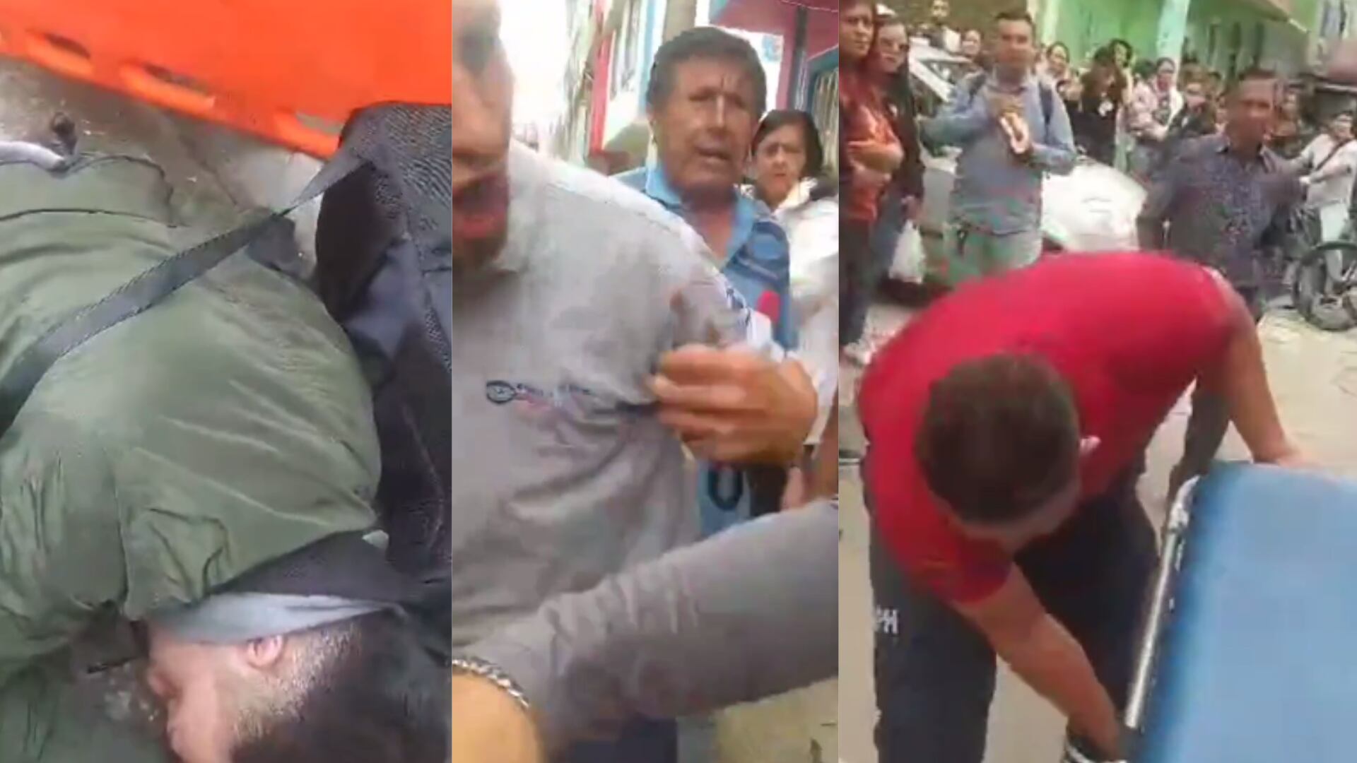 Un paramédico intentó subir al herido a una camilla, pero otros dos la emprenden a golpes contra este por llevarse al lesionado, como si se tratara de un paquete de encomienda.