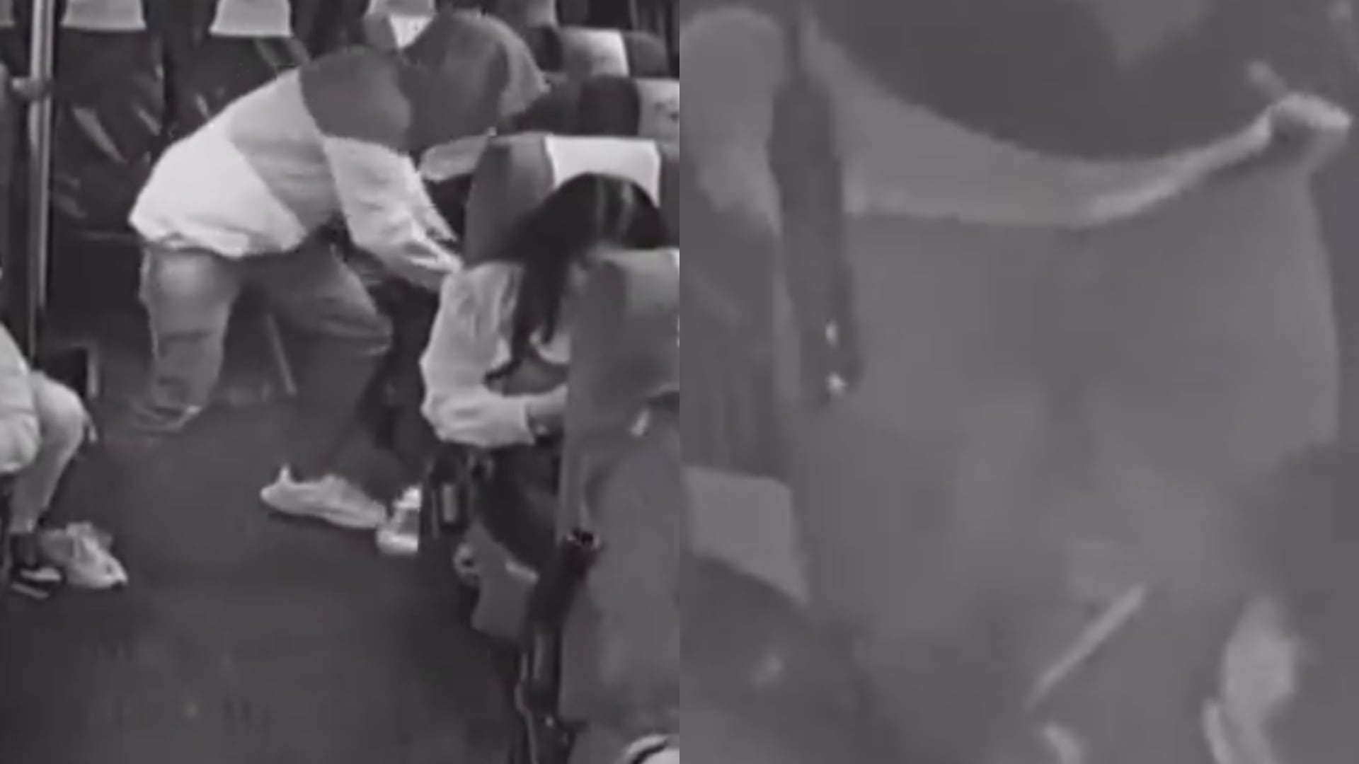 En otro segundo de la grabación que marca las 8:20 de la noche, se ve como una joven, asustada, se levanta e intentar salir del bus, pero es amenazada por uno de los asaltantes, quien ya tiene en su poder al menos un celular.