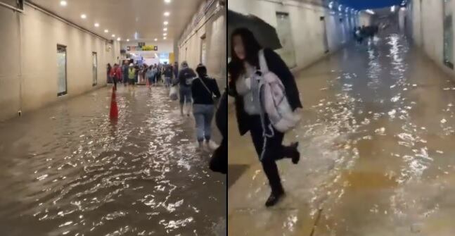 En redes fueron compartidos videos en el que se puede ver cómo los ciudadanos tienen que chapalear en el agua por los hondos charcos que se formaron al interior de este principal portal en Suba