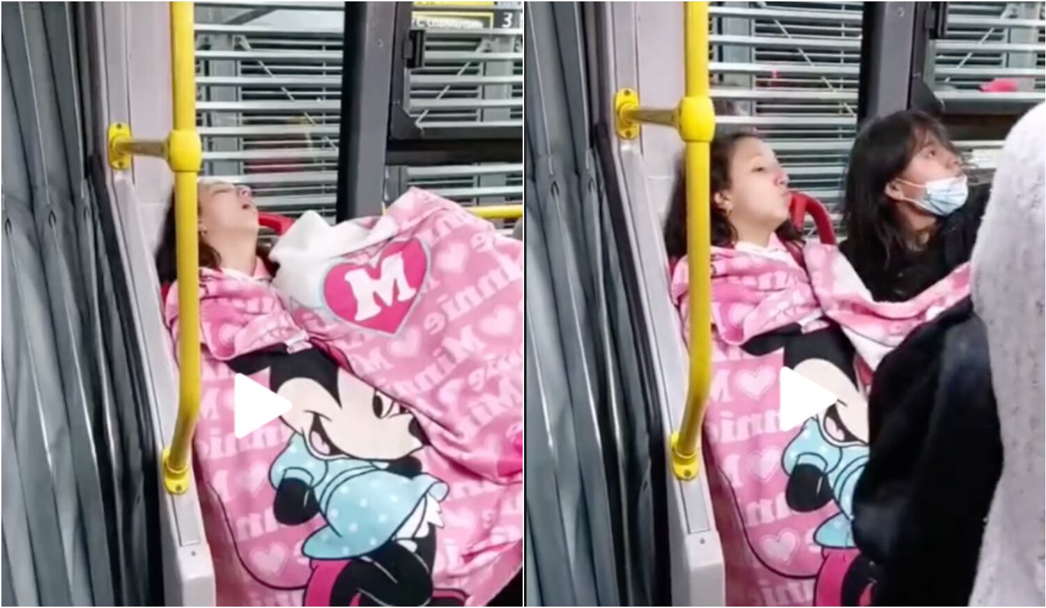 Según lo que se puede ver en la grabación, las dos personas van sentadas en un articulado, completamente dormidas, y cubiertas con una cobija rosada de Minnie y Mickey. Sin embargo, un pasajero le tocó el hombro a uno de ellos porque era tal la comodidad que tenían que estaban ocupando una silla de más y ningún otro pasajero se podía sentar ahí.