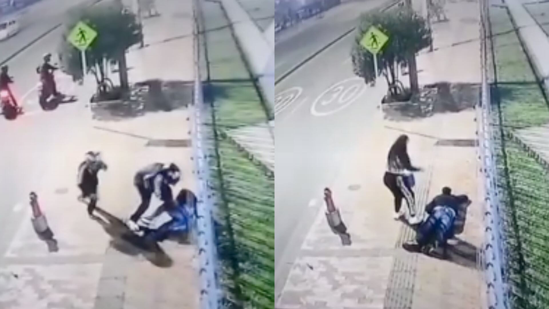 Los asaltantes corren hacia las motos y huyen del lugar. La pareja de la víctima se acerca, lo mira y se le ve desesperada intentando pedir ayuda.