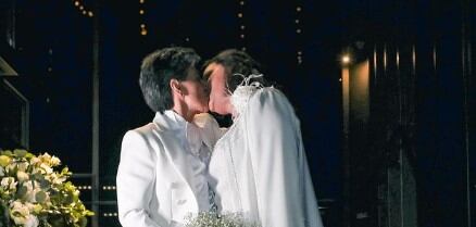 Por su parte, Lozano viste un pantalón blanco y en la parte superior una blusa con apliques plateados, un modesto escote en forma de corazón y abrigo del mismo color, además en sus manos tiene un arreglo de pequeñas flores blancas.
