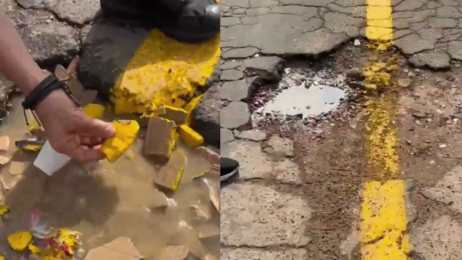 En el video compartido por el medio de comunicación se puede ver como uno de los habitantes del sector se acerca al enorme bache, para mostrarle a la cámara como a pesar de que en esa zona el asfalto se encuentra hecho pedazos, los trabajadores encargados de pintar las líneas de color amarillo, decidieron continuar con el trazado pasando sobre el hueco, aplicando pintura a las partes de la vía que se encuentran en pedazos.