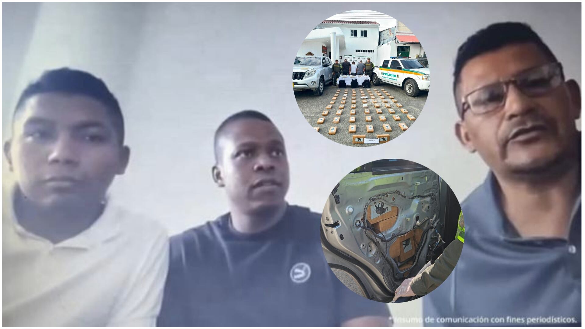 Los tres hombres fueron detenidos por la Policía de Tránsito mientras se desplazaban en un vehículo por la vía que conduce del municipio de Sevilla (Valle del Cauca) hacia Armenia (Quindío). Durante la inspección del vehículo, se descubrió que transportaba 65 bloques de la sustancia estupefaciente distribuidos en las puertas y sillas traseras.