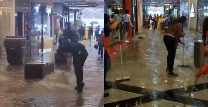 En varios videos que circularon en redes se puede cómo hasta el personal de seguridad del Centro Comercial Unicentro tuvo que tomar escobas para sacar el agua del primer piso. Allí se pueden ver cómo mostradores y almacenes quedaron inundados.