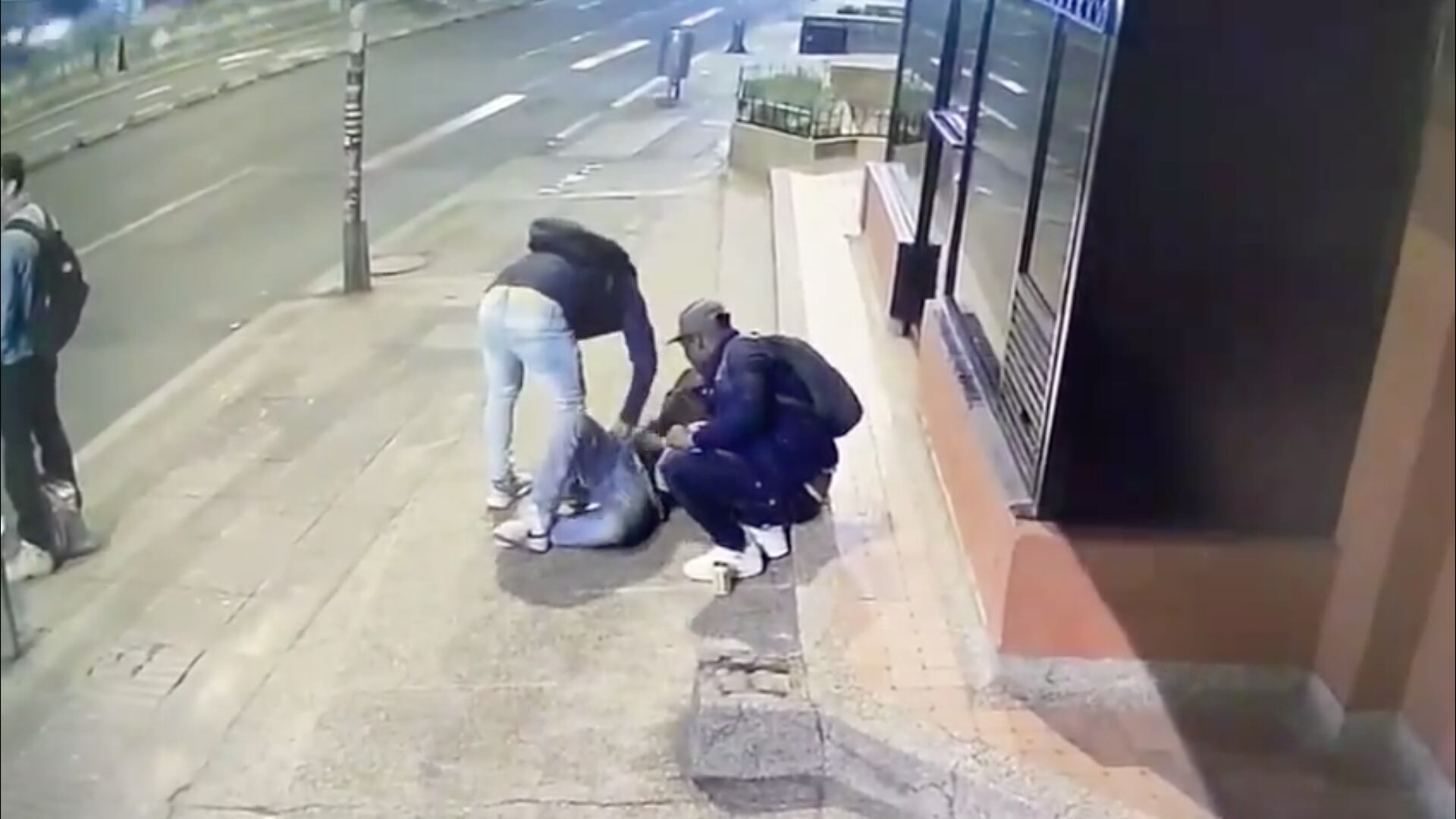 En efecto, en el video se observa cómo el periodista se encuentra tendido en el piso. Uno de los ladrones lo tiene agarrado de las manos y el otro, mientras tanto, lo escucla y trata de robarle lo que tiene. En el encuadre se alcanza a observar que hay otro sujeto que se encuentra de espaldas a la escena y que, según la versión de Celis, estaba vigilando que nadie interviniera o que las autoridades no vinieran en rescate del periodista.