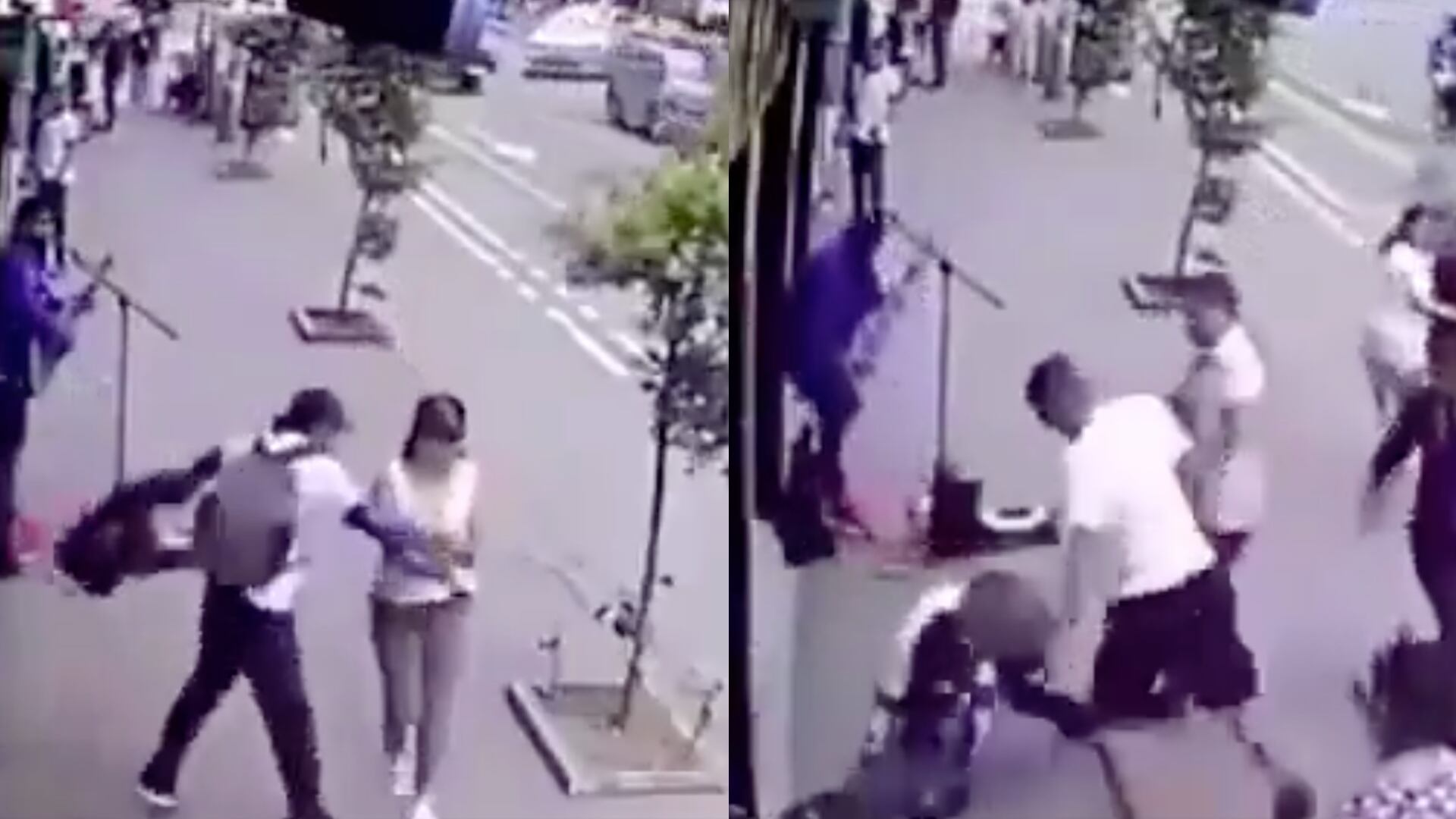 En el clip que es compartido en redes sociales, se puede observar que el hombre en una primera oportunidad agrede a una joven que va pasando, lastimándola en su estómago, unos segundos después un grupo de personas que iban por ese camino, también es víctima del agresor, sin embargo no pasa desapercibido y dos señores “le dan su merecido”.