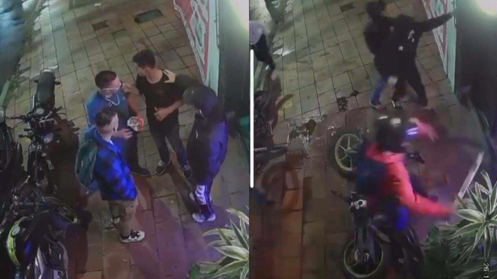 En las imágenes se puede ver que la agresión la inicia un hincha de Santa Fe, cuando de manera inesperada con un casco de moto, golpea fuertemente a uno de los hombres que estaba en el lugar. De allí empiezan a llegar más seguidores del club rojo con pistolas y armas cortopunzantes.
