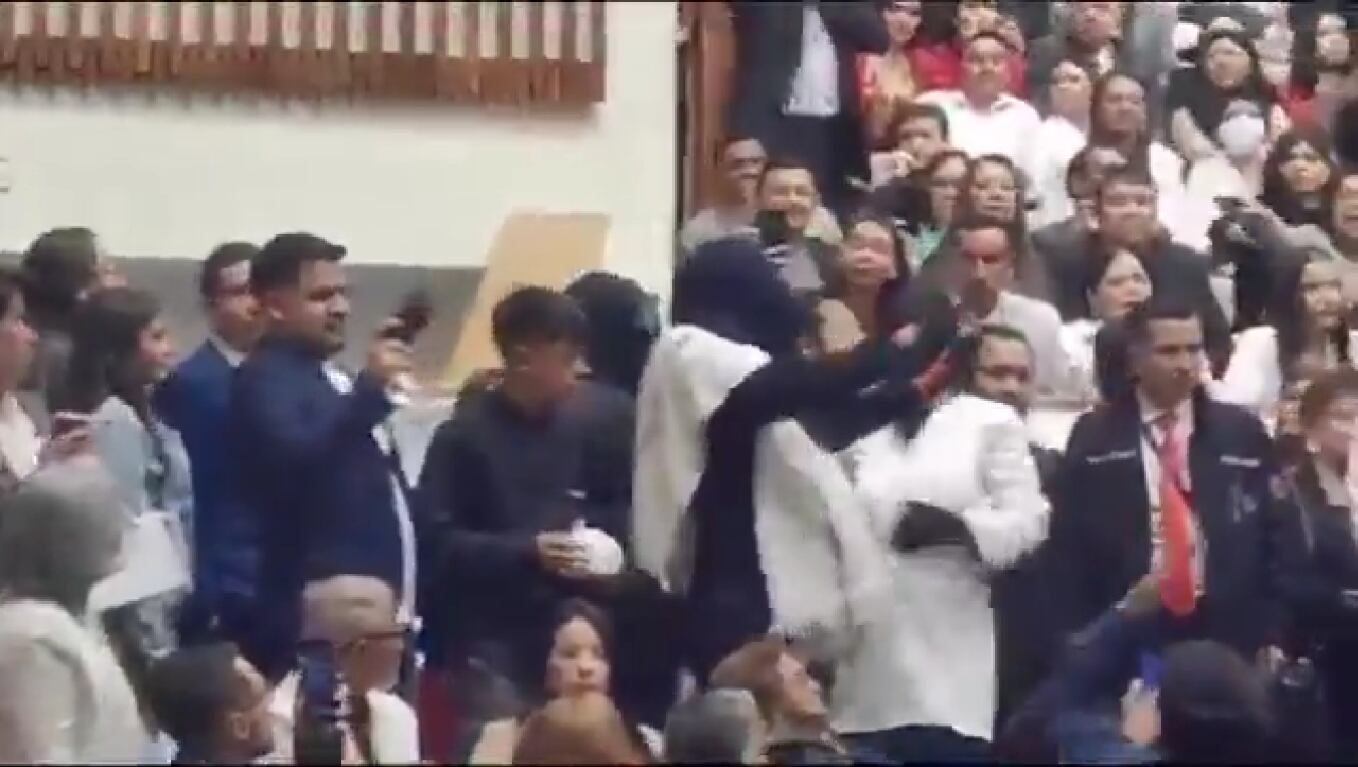 Uno de ellos alzó las manos en señal de protesta debido a los gritos que está recibiendo, pero no logró apaciguar la ira de la multitud que seguía pidiéndoles que se fueran del auditorio. Aunque en el video que fue difundido en redes sociales no se alcanzó a ver cuando los encapuchados salieron del recinto, en redes sociales indicaron que lograron que lo abandonaran de forma pacífica.