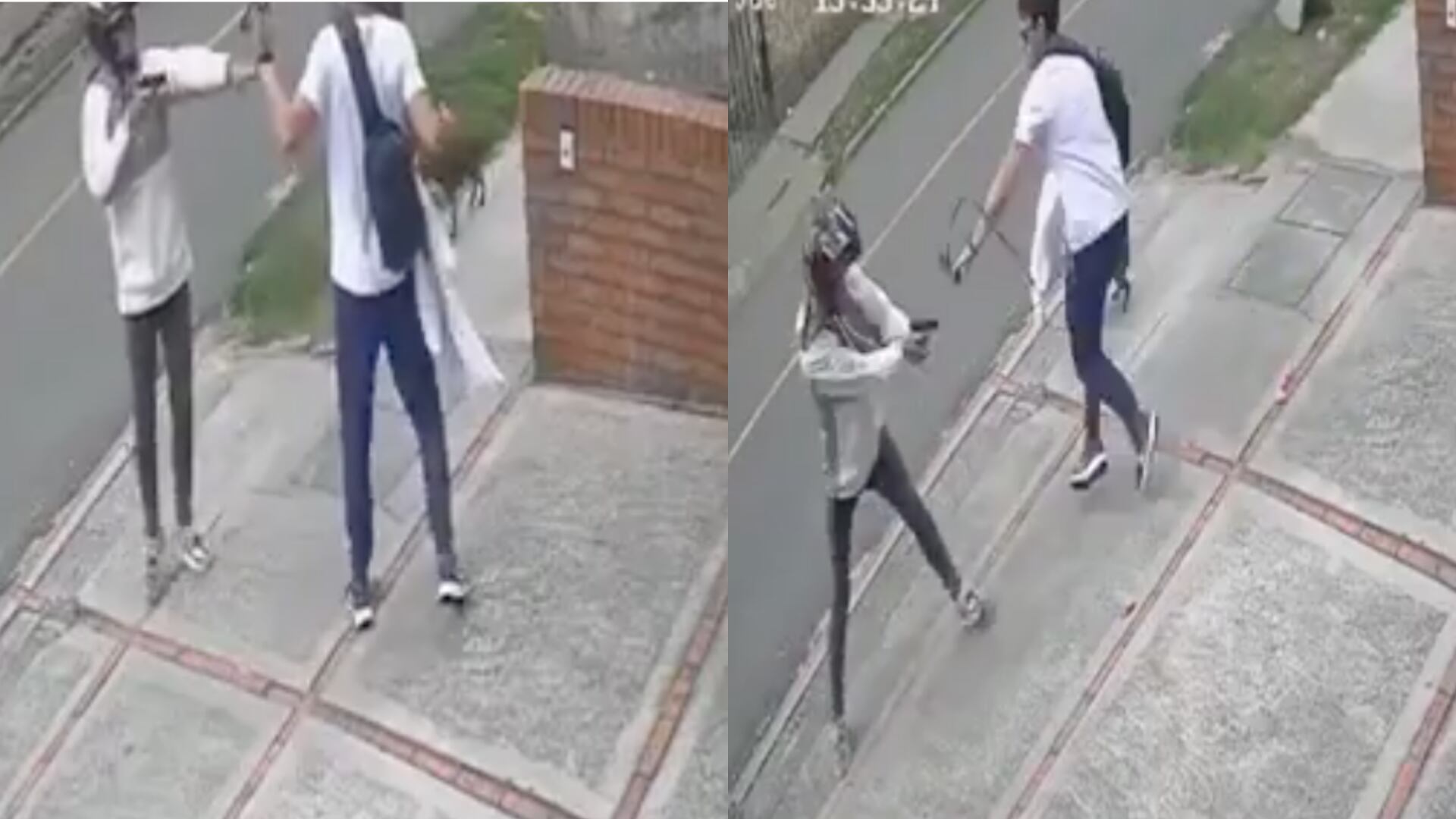 Gracias a una cámara de seguridad, se logró ver a un hombre paseando a su mascota cerca a su casa, cuando un par de delincuentes llegan en una motocicleta y se acercan a él, buscando hurtarle sus pertenencias. En ese momento, uno de los dos criminales le apuntan con un arma de fuego, buscando intimidarlo para que le entregara sus pertenencias.