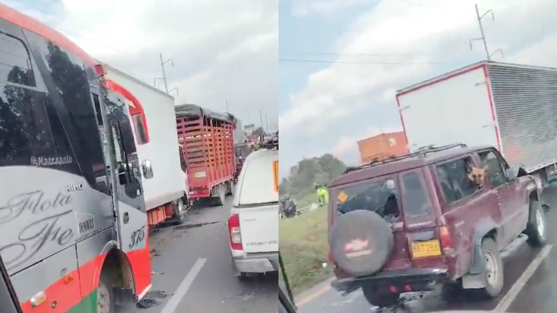 En redes sociales se difundieron imágenes en las que los estragos que se generaron en la vía La Vega - Bogotá, a causa de un choque múltiple en el que por lo menos cinco vehículos se vieron involucrados. Las imágenes dejan ver que un bus de transporte público intermunicipal estrelló a un camión por atrás, lo que generó que el camión impactado chocara contra un camión de transporte de animales que iba delante de este.