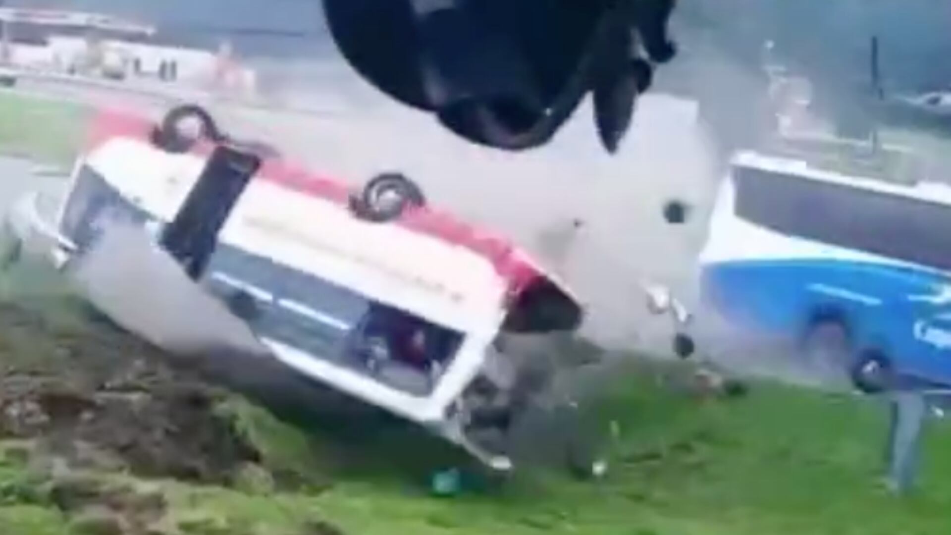 El fuerte impacto de ambos buses dejó como mayor afectado al bus que se había detenido a recoger a un pasajero en un costado de la vía, ya que este salió volando, dio una vuelta completa y terminó destrozado. De igual forma, las personas que iban al interior de este bus llevaron la peor parte, varios salieron literalmente volando del vehículo, entre ellos el conductor.