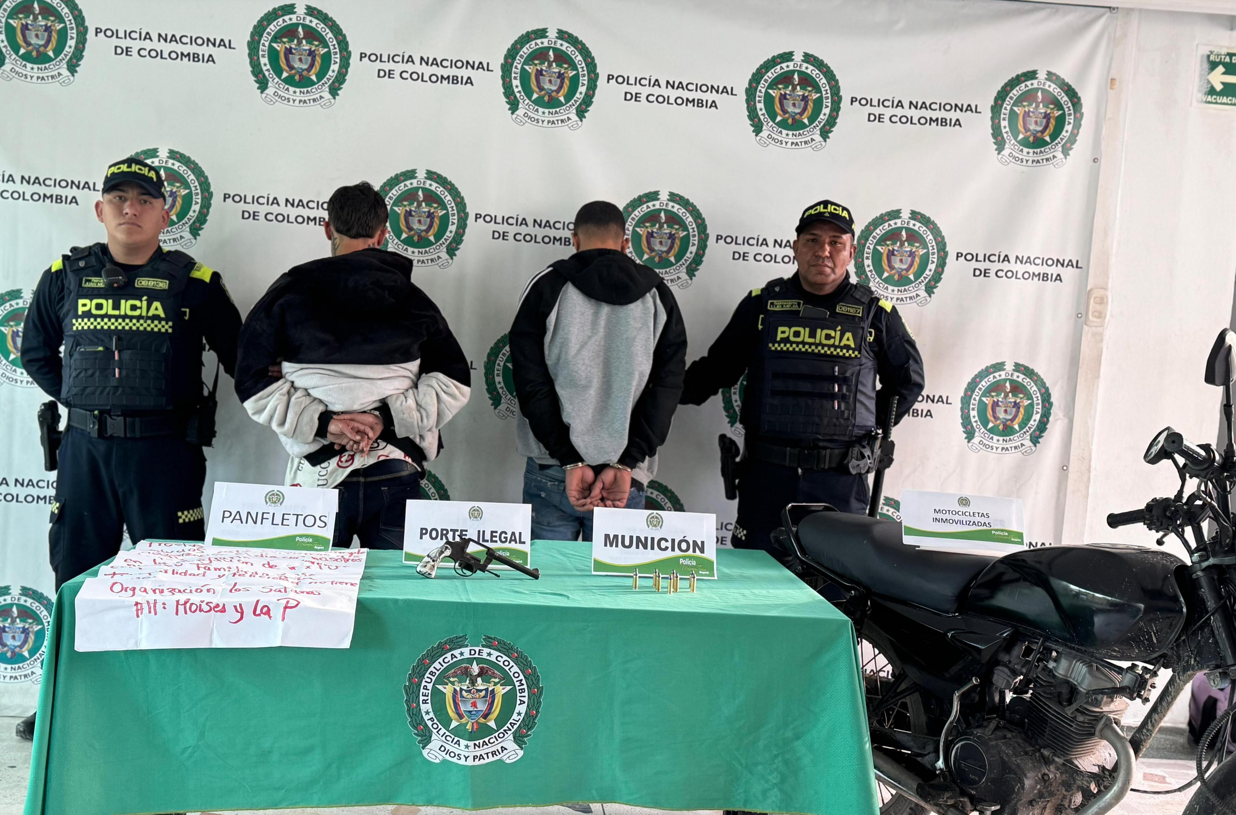 “La acción policial se desarrolló tras identificar comportamientos sospechosos mientras se desplazaban en una motocicleta. Al ser interceptados, les fue hallada un arma de fuego con nueve cartuchos y un panfleto con amenazas dirigidas a un comerciante del sector”, indicó la Policía a través de un comunicado de prensa publicado en la mañana de este sábado 5 de julio.