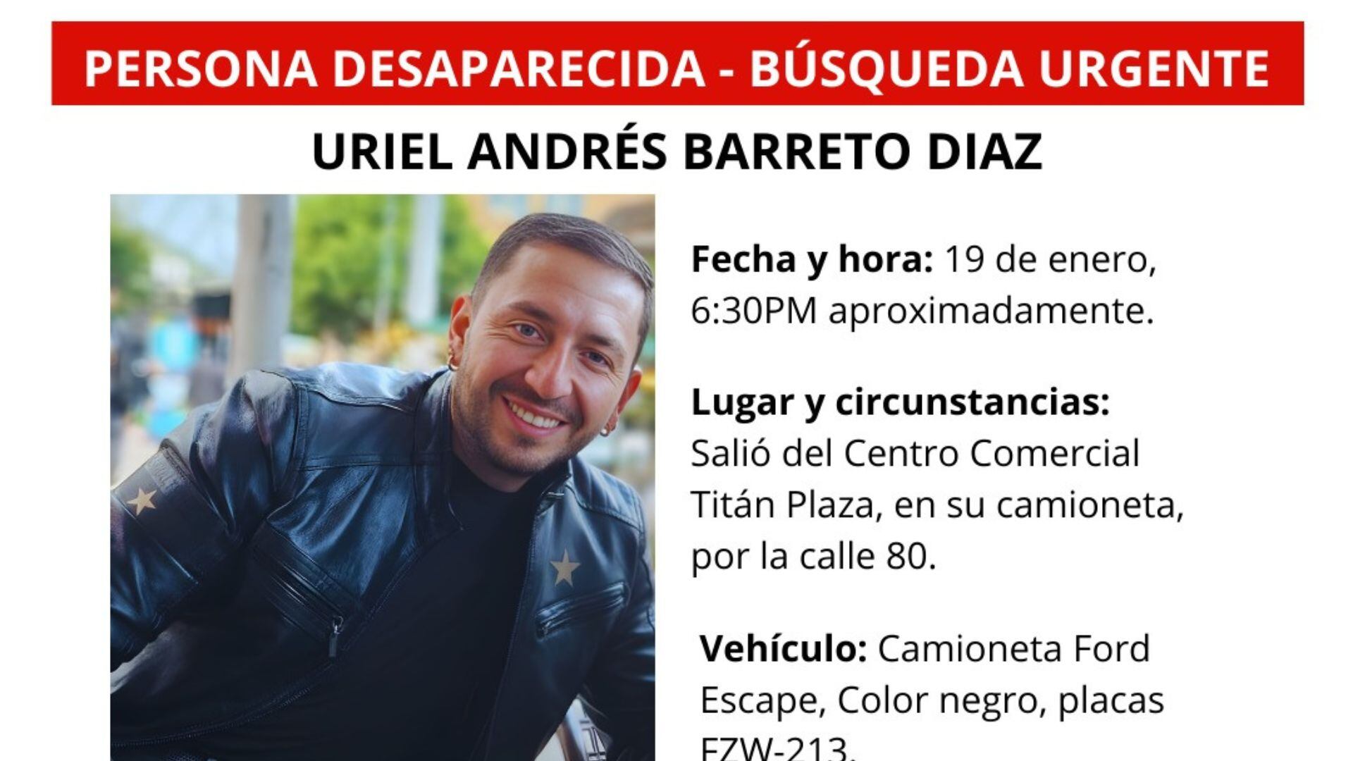Los familiares de Uriel Andrés Barreto Díaz han atravesado una semana difícil debido a que desapareció el pasado lunes 19 de enero. Lo último que se supo de él fue que salió en su camioneta del centro comercial Titán Plaza sobre las 6:30 de la tarde.