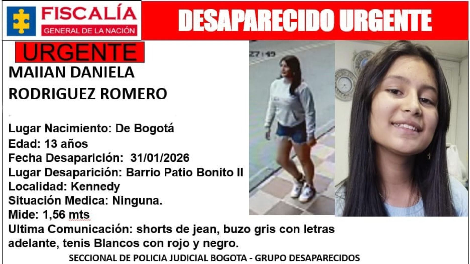 Un triste caso de desaparición se presentó el pasado 31 de enero en el barrio Patio Bonito II, de la localidad de Kennedy, en el suroccidente de Bogotá. Se trata de Maiian Daniela Rodríguez Romero, una niña de 13 años.