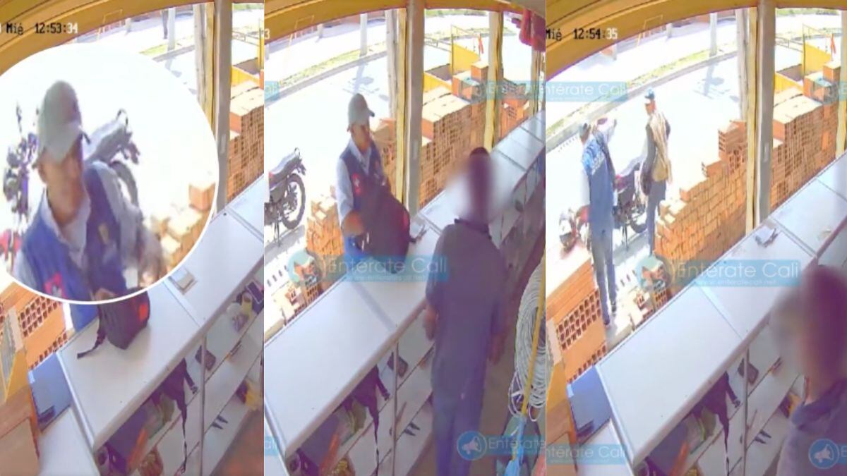 Una persona, al parecer con un chaleco de autoridades públicas de Cali, se acercó hasta la vitrina de una ferretería a preguntar por el precio un producto, mientras buscaba algo en el maletín que tenía, mientras la persona se acercó a atenderlo y decirle el precio, llegó otra persona al establecimiento.