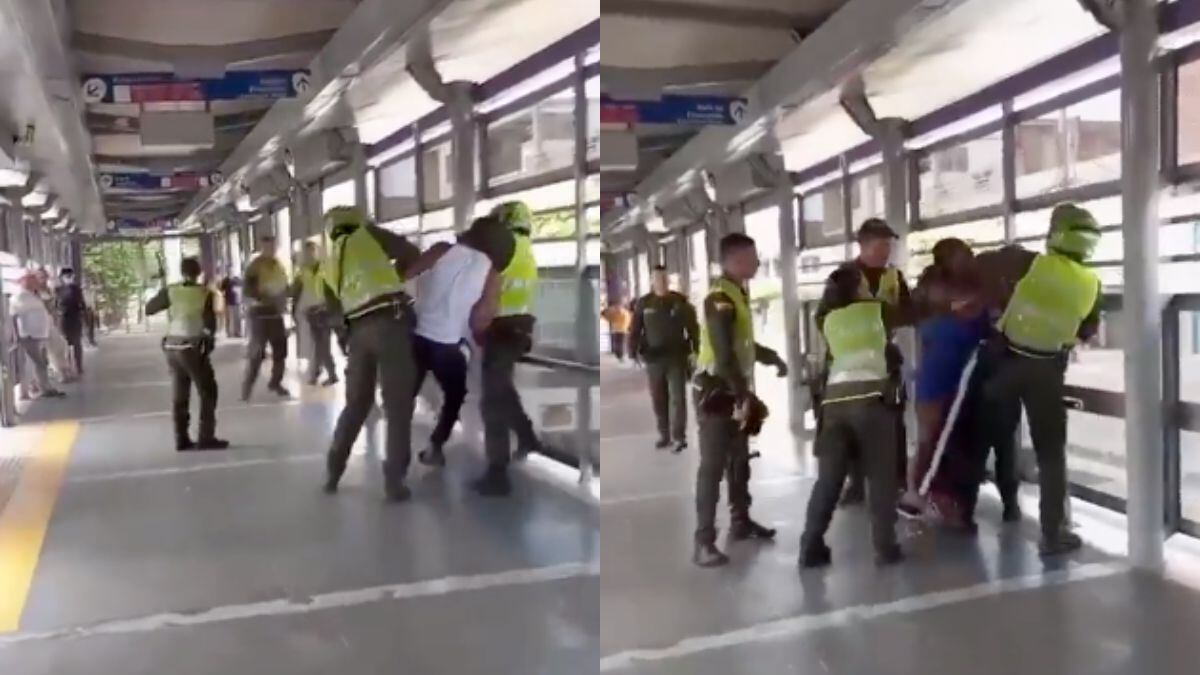 Los Policías se acercaron a pedirle a las dos personas que salieran del lugar y ambos se segaron, lo que llevo a los uniformados a bajarlos por la fuerza de la estación, pues los usuarios ponían resistencia.