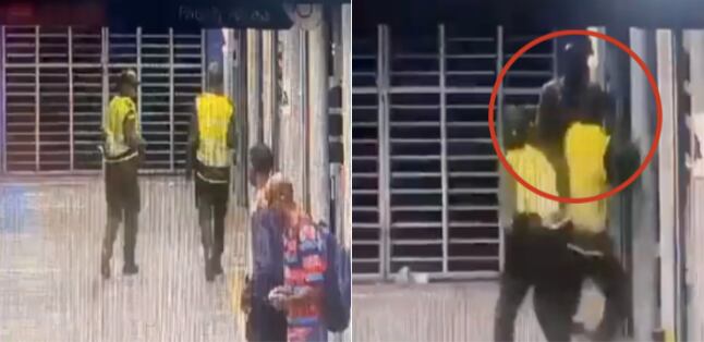 En la grabación se puede observar a los dos uniformados caminar en la estación del MÍO, cuando de la nada se voltean y salen a correr, cuando los uniformados “escapan” en dirección contraria al sujeto, se puede observar a un hombre sujetando un arma, por la que presumen que los uniformados salieron corriendo.