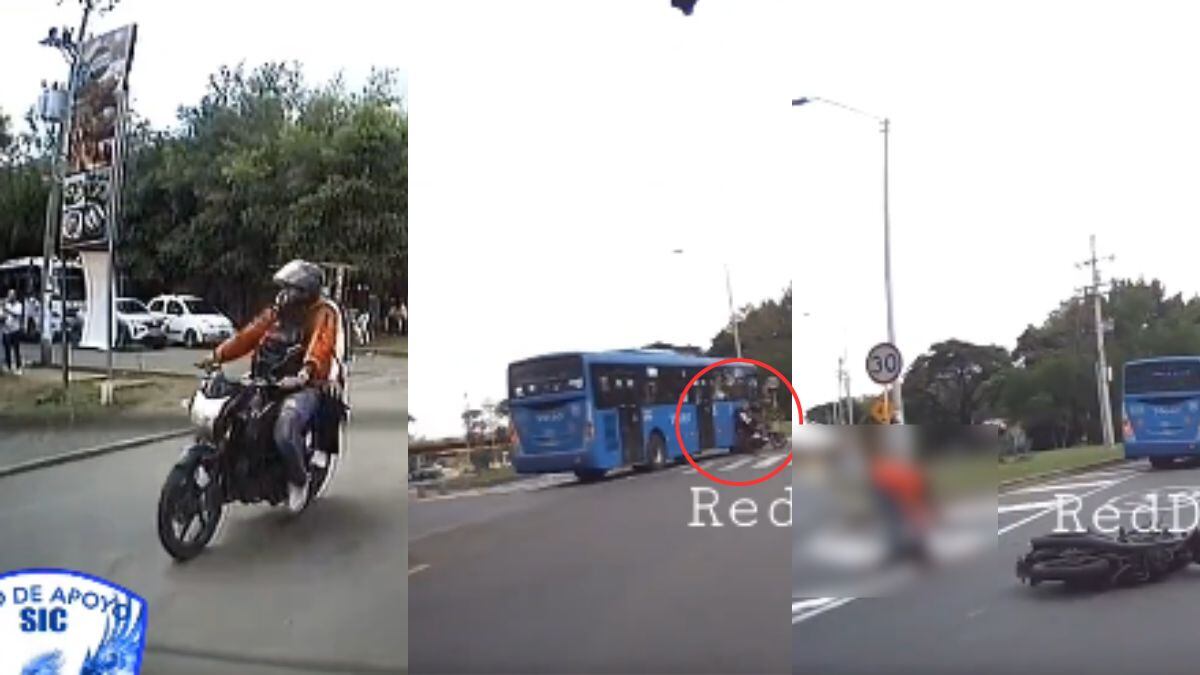 En las imágenes se puede observar que el conductor de la moto se pasó el semáforo en rojo y se alcanza a observar que no iban a alta velocidad, metros después el MÍO iba a tomar su carril e impactó fuertemente a las dos personas.