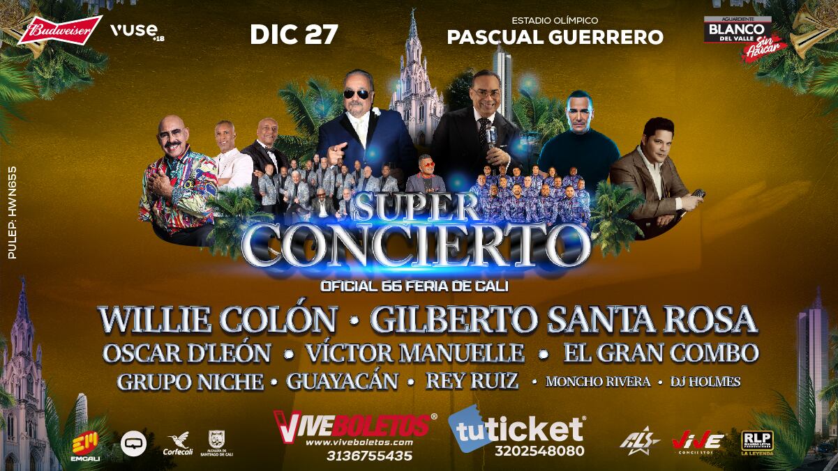 La cita es este 27 de diciembre en el estadio Pascual Guerrero, una tarima donde se presentará Willie Colón, Gilberto Santa Rosa, Óscar D’león, Víctor Manuelle, Rey Ruiz, El Gran Combo de Puerto Rico, Grupo Niche, Guayacán Orquesta, Moncho Rivera y Dj Holmes.