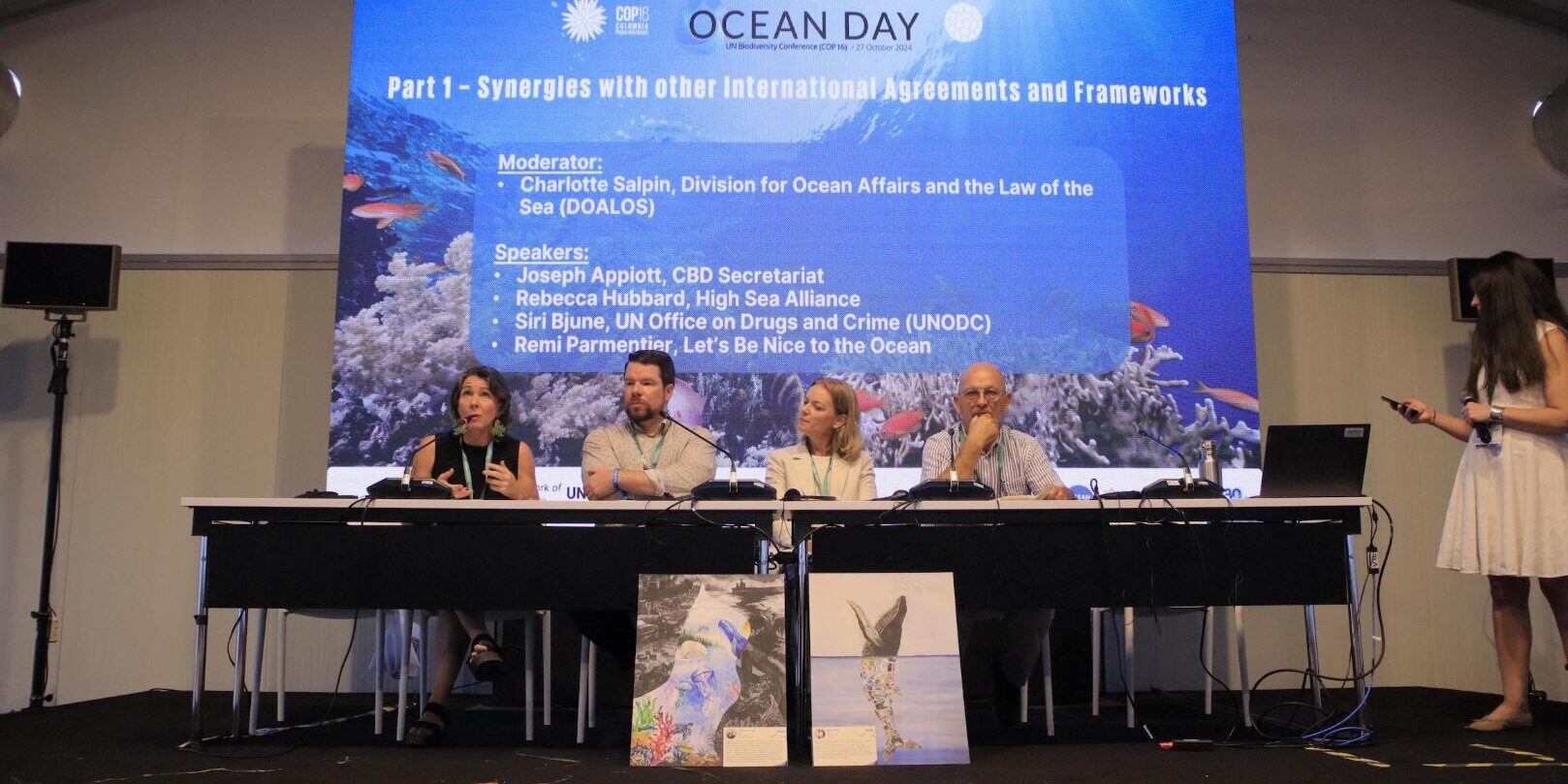 El evento, realizado en la Zona Azul de la COP16, reunió a figuras clave de la agenda oceánica, incluyendo a Joseph Appiot de la Secretaría de la Convención sobre la Diversidad Biológica (CBD), Rebecca Hubbard de la High Seas Alliance, Siri Bjune de la Oficina de las Naciones Unidas contra la Droga y el Delito (UNODC) y Remi Parmentier, fundador de Let’s be nice to the ocean.