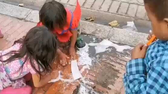En la imagen se ve cómo los niños pequeños toman sus tapabocas y los lavan en un charco en un andén. Para limpiarlos utilizan aparentemente jabón de loza. El hecho habría sido grabado en el campamento indígena del Parque Tercer Milenio, pleno centro de Bogotá.
