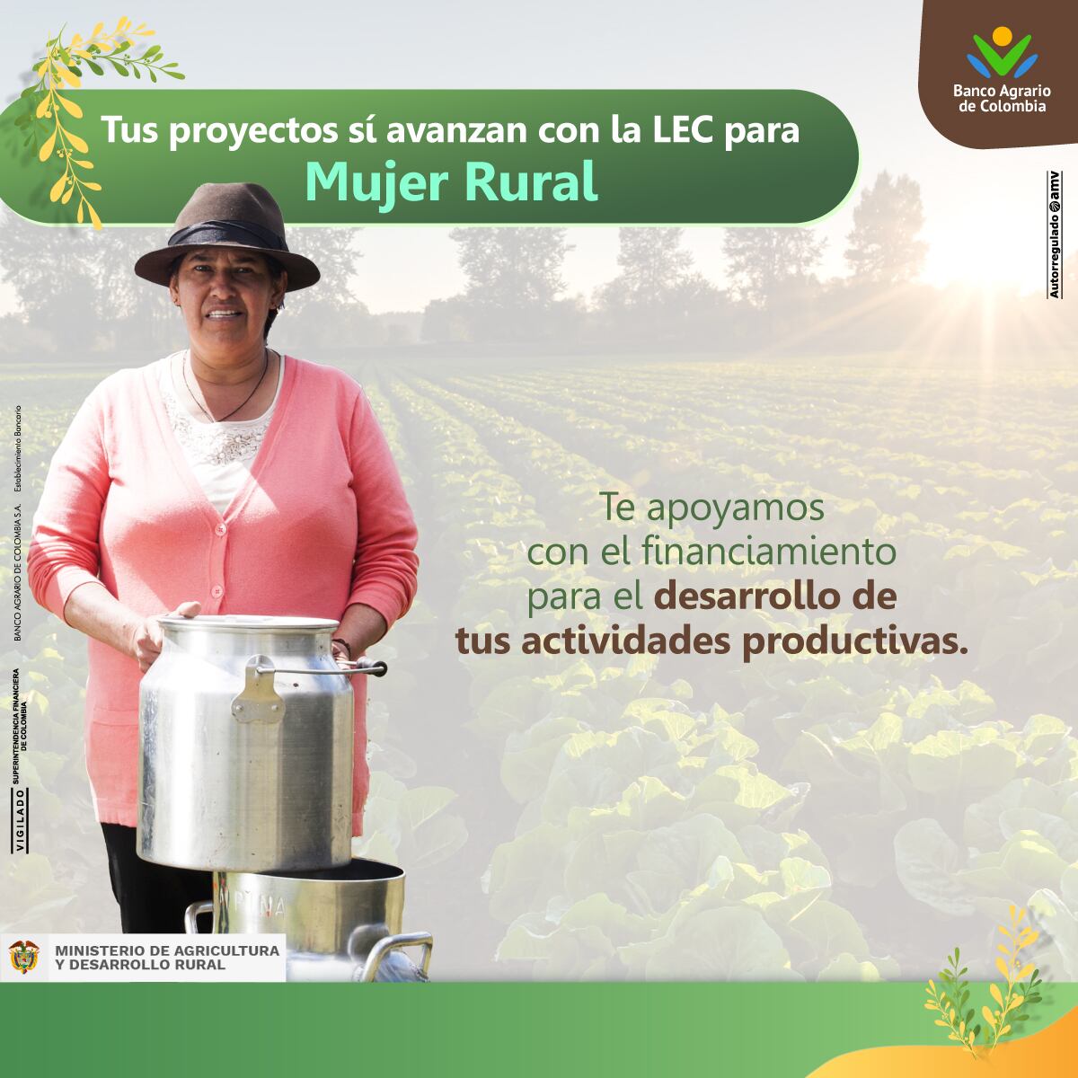 Es por esto que, el Banco Agrario de Colombia ha diseñado una Línea Especial de Crédito (LEC) llamado Mujer Rural, la cual promueve el acceso al financiamiento de sus proyectos y permite que se desarrollen actividades productivas bajo la equidad de género.