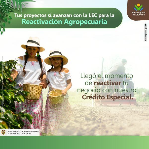 Sin embargo, para esto el Banco Agrario de Colombia presenta su Línea Especial de Crédito (LEC) Reactivación Agropecuaria, una alternativa financiera cuyo propósito es apoyar la reactivación de los productores que se han visto afectados por catástrofes naturales, emergencias fitosanitarias o zoo sanitarias, situaciones climáticas extremas, crisis económicas generadas por pandemias o por alteraciones de orden público.