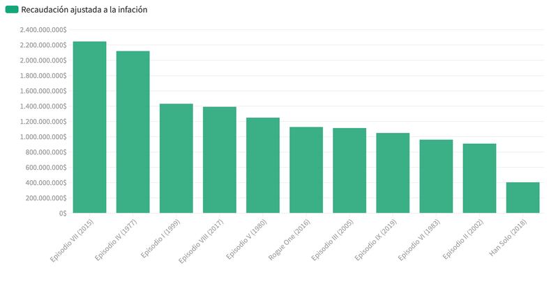 Sin embargo, en cuanto las cifras realizadas por Xataka muestran que ‘Star Wars: Episodio VII: El despertar de la fuerza’ (2015) recaudó casi 2.300 millones de dólares, ajustando la inflación, superando por unos 150 millones al ‘Una nueva esperanza’ (1977).