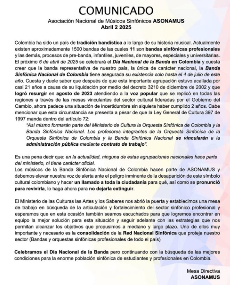 Según lo manifestado en dicho comunicado: “Actualmente, existen aproximadamente 1.500 bandas, de las cuales 11 son bandas sinfónicas profesionales (...) El próximo 6 de abril de 2025 se celebrará el Día Nacional de la Banda en Colombia, y cuesta creer que la banda representativa de nuestro país, la única de carácter nacional, la Banda Sinfónica Nacional tiene asegurada si existencia solo hasta el 4 de julio de este año”.