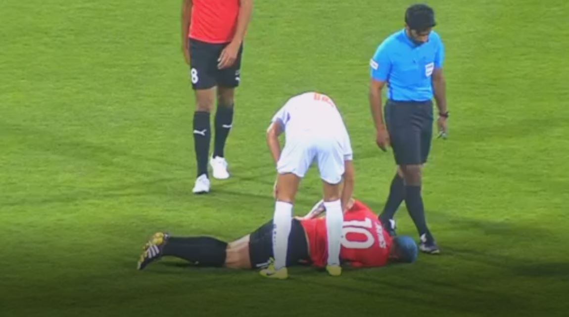 Durante el segundo tiempo fue a disputar un balón con Khaled Al Zereiqi que con su rodilla impactó en la parte baja de la espalda de Rodríguez.