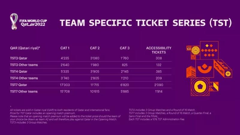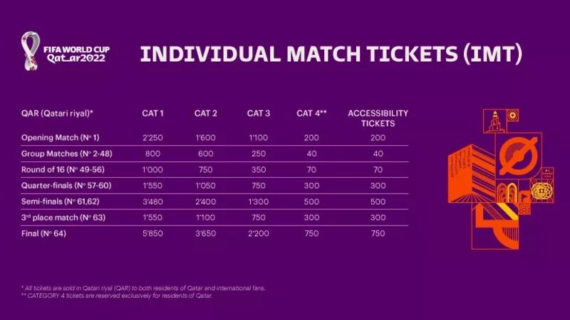 Todas las entradas se venderán en riyal qatarí (QAR) tanto para residentes de Qatar como para aficionados internacionales. Las categorías de entradas 1, 2 y 3 están disponibles para todos los aficionados.