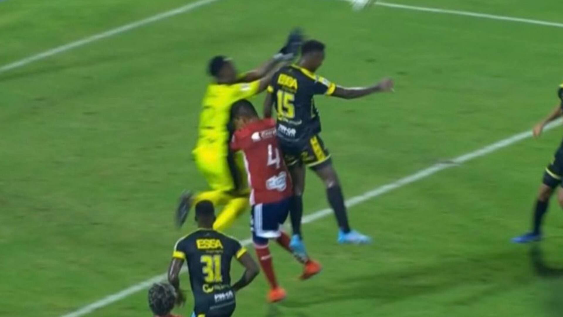 Más tarde, en el 70, ocurrió la acción más polémica de la noche. Se trató de un gol anulado a Alianza Petrolera. El tanto llegó tras una terrible salida del arquero Vásquez, la cual dejó el balón libre para que Jaider Riquett lo empujara dentro del arco. Increíblemente, el árbitro, con ayuda del VAR, señaló una falta contra el arquero y el marcador se mantuvo 1-1. Si eso es falta, apague y vámonos.