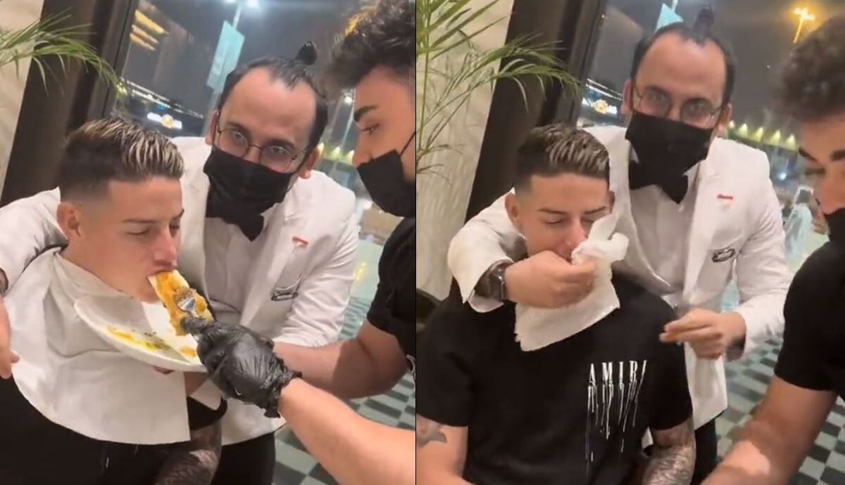 Al parecer en la tradición del lugar, le dan a degustar directamente a la boca del colombiano. James come su bocado y hace el signo de aprobación con su pulgar arriba y de inmediato, como si se tratara de un niño pequeño, el mesero le limpia la boca con la enorme servilleta y el otro empleado le comienza a porcionar la comida.