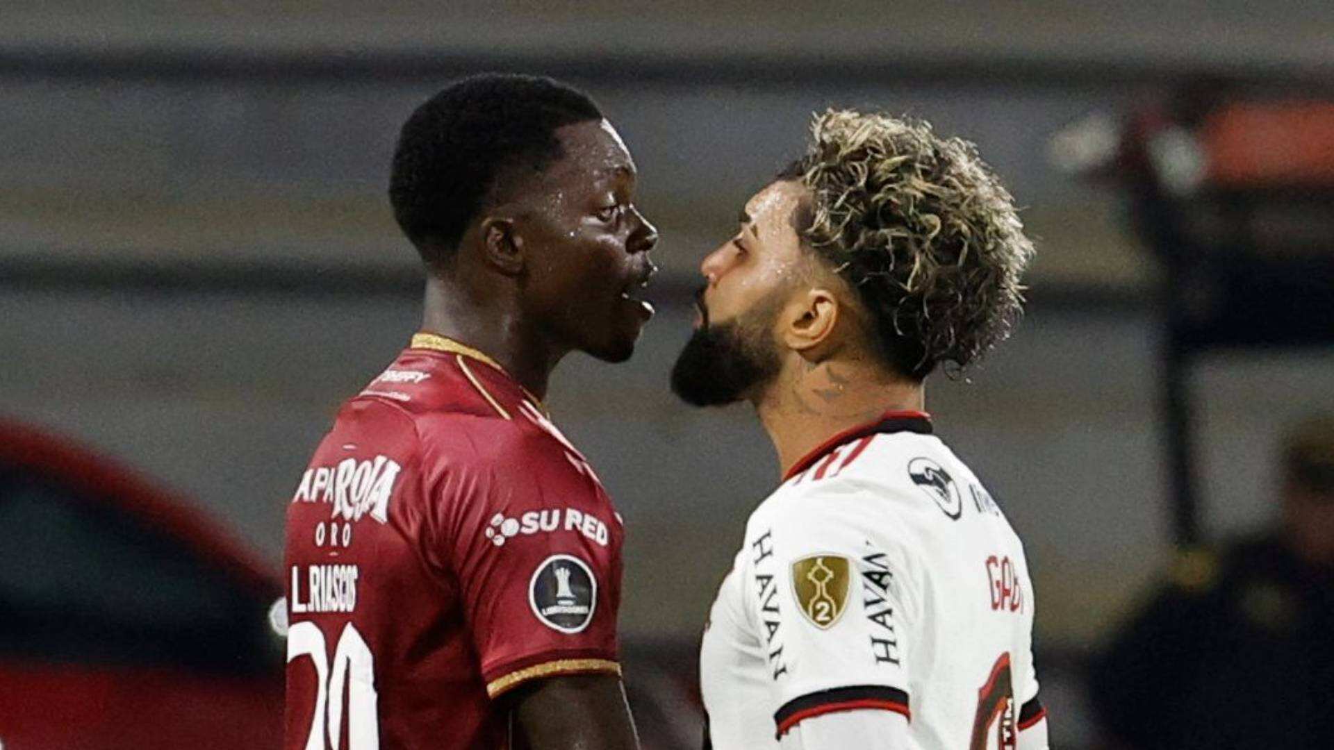 En el segundo tiempo del partido, cuando el marcador estaba 0-1 a favor de Flamengo, ‘Gabigol’ y Riascos protagonizaron un duelo cerca de la mitad de la cancha. El colombiano, quien es uno de los jugadores menos experimentados del equipo tolimense, no se arrugó y enfrentó sin problemas al brasileño. Con el pecho, él empezó a empujar a su rival, lo que provocó que el árbitro interviniera para que la situación no pasara a mayores.