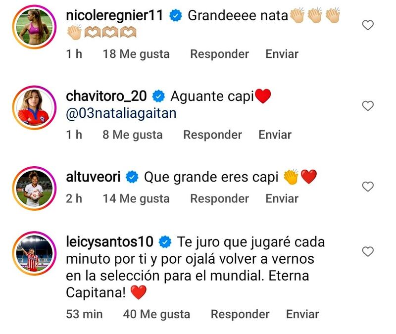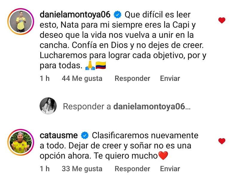 Daniela Montoya señaló que para ella Gaitán siempre será “La Capi” y que junto al resto del combinado ‘cafetero’ lucharán “para lograr cada objetivo, por y para todas”. Catalina Usme, por su parte, expresó algunas palabras de ánimo para la bogotana: “Dejar de creer y soñar no es una opción ahora”.