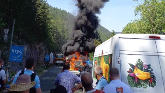 Todo esto ocurrió en el acceso a la meta de la 14ª del Tour de Francia, quedando bloqueado por varios minutos debido al impactante incendio que alarmó a más de uno de los accidentes, pues estaba muy cerca de la pancarta del último kilómetro.