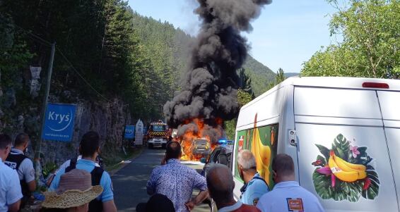 Todo esto ocurrió en el acceso a la meta de la 14ª del Tour de Francia, quedando bloqueado por varios minutos debido al impactante incendio que alarmó a más de uno de los accidentes, pues estaba muy cerca de la pancarta del último kilómetro.