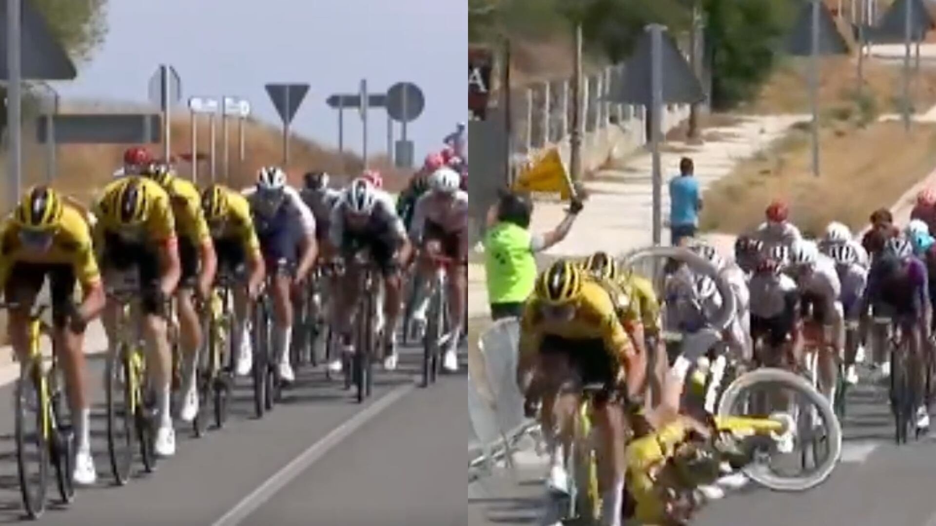 Cuando el equipo Jumbo se preparaba para el sprint, se acomodó en la cabeza de carrera con sus corredores. David Dekker, gregario del equipo, enredó su rueda delantera con un badén (o reductor de velocidad) y sufrió un fuerte golpe en la cabeza.